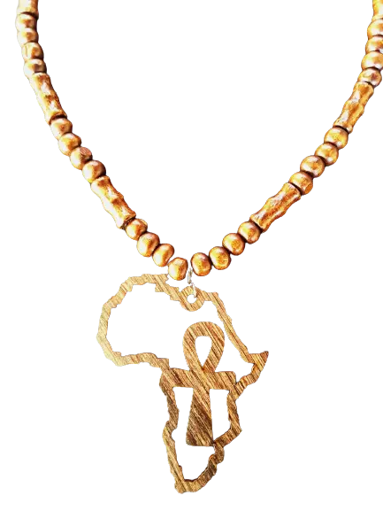 African Wooden Ankh Necklace set within the continent of Africa. The necklace piece is made with African wooden beads. This piece has deep spiritual meaning linking to our ancestors of Ancient Kemet.